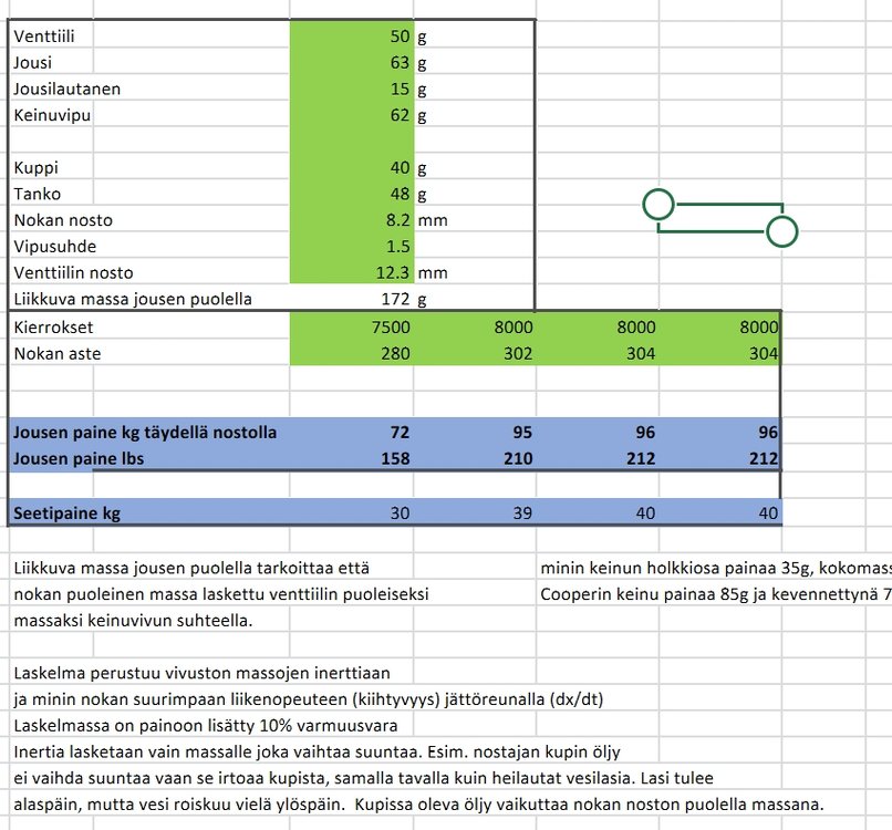 Moi, Jos lisäät nostoa esim. 1mm, nostosta 6.6:sta 7.6een, nokalla kilot riittää koska tuon millin takia korkealla nostolla tulee lisää jousipainetta, mutta sitten kun se samalla seetipaineella menee kiinni, niin rupee pompimaan ja kone röpöttää. Seetipainetta pitää kasvattaa ja se ei muutu kuin shimmaamalla tai jousia vaihtamalla. Minin vakionokka on jotain 225-230, toi muutos 270-280 on huima, jolloin vakio ei enää riitä millään, unohda toi lause tuosta paperista.. Lisäät kierroksia riittävästi niin jättöreunalla kuppi ei mahdollisesti seuraa nokkaa ollenkaan ja seurauksen on että venttiili hakkaa itsensä täydestä nostosta suoraan seetiin. Minin vakijousessa on seetipaine muutenkin älyttömän pieni. Älä riko konetta huudattamalla röpötykseen asti. Youtubeen hakusanoiksi valve float tai valve bounce ja löytyy hauskoja juttuja.